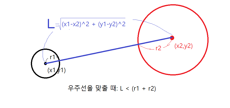from tkinter import * import time import random WIDTH = 800 HEIGHT = 400 score = 0 #점수 변수 추가 class Ball: def __init__(self,canvas,color,size,x,y,xspeed,yspeed): self.canvas = canvas self.color = color self.size = size self.x = x self.y = y self.xspeed = xspeed self.yspeed = yspeed self.id = canvas.create_oval(x,y,x+size,y+size,fill=color) def move(self): self.canvas.move(self.id, self.xspeed, self.yspeed) (x1,y1,x2,y2) = self.canvas.coords(self.id) (self.x, self.y) = (x1,y1) if x1<=0 or x2>=WIDTH: self.xspeed = -self.xspeed if y1<=0 or y2>=HEIGHT: self.yspeed = -self.yspeed bullets = [] def fire(event): bullets.append(Ball(canvas, "red", 10, 150, 250, 10, 0)) window = Tk() canvas = Canvas(window, width=WIDTH, height=HEIGHT) canvas.pack() canvas.bind("<Button-1>",fire) spaceship = Ball(canvas,"green",100,100,200,0,0) enemy = Ball(canvas, "red", 100, 500, 200, 0, 5) label = canvas.create_text(150,100,text=str(score)+"점") #처음에 0점을 보여줌 while True: for bullet in bullets: bullet.move() if (bullet.x+bullet.size)>=WIDTH: canvas.delete(bullet.id) bullets.remove(bullet) bullet_x = bullet.x + bullet.size * 0.5 #총알 중앙에 위치한 x좌표 bullet_y = bullet.y + bullet.size * 0.5 #총알 중앙에 위치한 y좌표 enemy_x = enemy.x + enemy.size * 0.5 #적 중앙에 위치한 x좌표 enemy_y = enemy.y + enemy.size * 0.5 #적 중앙에 위치한 y좌표 # 총알의 중심과 적의 중심 사이의 거리가 각각의 반지름을 합한 것보다 작거나 같을 경우 # 영역이 겹치므로 적을 명중시킨것과 다름없음 if ((enemy_x-bullet_x)**2+(enemy_y-bullet_y)**2)**0.5 < (enemy.size * 0.5+bullet.size * 0.5): score += 1 canvas.delete(bullet.id) bullets.remove(bullet) canvas.itemconfig(label, text=str(score)+"점") enemy.move() window.update() time.sleep(0.03)1. bullet_x, bullet_y, enemy_x, enemy_y 를 구하는 이유