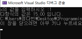 #define _CRT_SECURE_NO_WARNINGS #include <stdio.h> int main() { double x, y; printf("x의 값을 입력하시오 :"); scanf("%lf", &x); y = 5 * x * x * x - 2 * x * x + 3 * x + 9; printf("다항식의 값은 %.2lf 입니다.", y); return 0; }