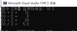 #include <stdio.h> int main() { int a, b; float c; printf("정수 2개를 입력하세요: "); scanf_s("%d %d", &a, &b); c = a / b; printf("%d + %d = %5d\n", a, b, a + b); printf("%d - %d = %5d\n", a, b, a - b); printf("%d * %d = %5d\n", a, b, a * b); printf("%d / %d = %5.1f\n", a, b, c); return 0; }