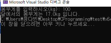 #include <stdio.h> int main() { double weight, moon_weight; printf("몸무게를 입력하시오(kg): "); scanf_s("%lf", &weight); moon_weight = weight * 0.17; printf("달에서의 몸무게는 %.1lfkg 입니다.", moon_weight); return 0; }