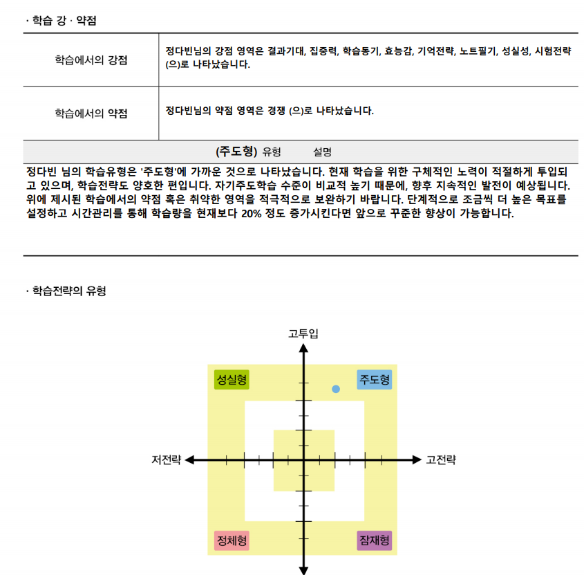 여기서 알아야할 점은 바깥에 큰 노랑색 직사각형 테두리에 있는 사람은 학습 전략 유형이 쉽게 바뀔 일은 없다고 합니다. 그래서 만약 성실형이라면 자신의 공부방법에 대해 진지하게 고민을 해보면서 전략을 짜야하고, 잠재형은 억지로라도 책상에 앉아있는 시간을 늘리라고 합니다.