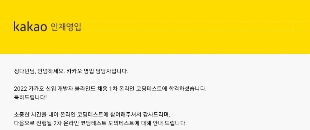 진행 정보 2022 KAKAO BLIND RECRUITMENT 전체 전형 절차 및 일정 지원 접수 : 8월 19일(목) ~ 9월 6일(월) 17:00 1차 코딩 테스트 : 9월 11일(토) 2차 코딩 테스트 : 9월 25일(토) 2차 코딩테스트는 1차 코딩테스트