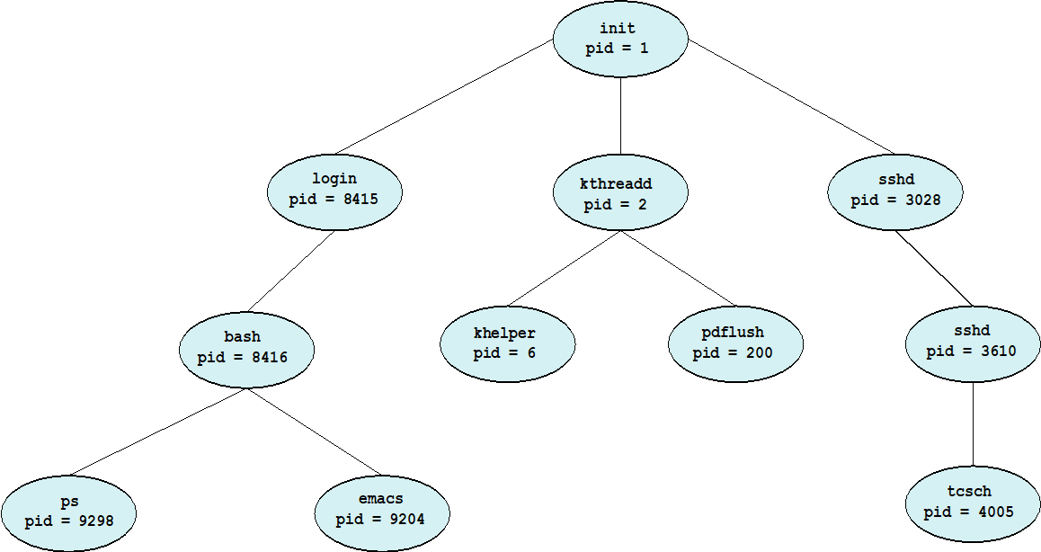 프로세스는 실행되는 동안 여러 개의 프로세스를 생성할 수 있다. 이때 원래 있던 프로세스는 부모 프로세스라고 하고, 생성된 프로세스들을 자식 프로세스라고 한다. 이 구조는 트리를 형성한다.
