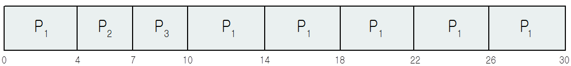 이때 시간 할당량이 4ms라면 프로세스 P1은 우선 4ms를 사용하고, 준비 큐의 꼬리에 넣어진다. 이후 프로세스 P2에 CPU를 할당하는데, 시간 할당량보다 작으니 3ms에서 P2가 CPU를 방출시킨다. P3도 마찬가지로 3ms에서 CPU를 방출하고 P1이 들어오면 4ms를 수행하고 다시 준비 큐에 넣는 작업을 반복한다.