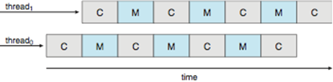 위 사진에서 스레드 0이 메모리 스톨 사이클일 때, 코어가 스레드 1로 전환하여 계산 사이클을 진행하는 것을 알 수 있다. 이후 스레드 1이 메모리 스톨 사이클이면 스레드 0으로 전환하여 계산하는 것을 반복한다.