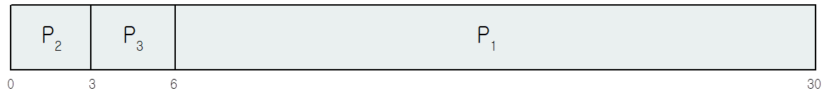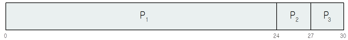 ex) 프로세스 P1 - 버스트 시간 24, 프로세스 P2 - 버스트 시간 3, 프로세스 P3 - 버스트 시간 3인 경우
