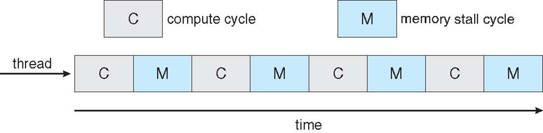 다중 스레딩 다중 코어 시스템 메모리 스톨을 해결하기 위해 하나의 코어에 2개 이상의 하드웨어 스레드가 할당된다. 이러면 메모리를 기다리는 동안 하나의 하드웨어 스레드가 중단되면, 코어가 다른 스레드로 전환할 수 있다.