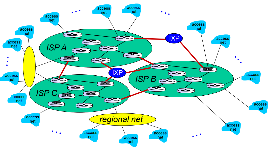 지구에 종단 시스템은 수십억 개인데 이것을 연결하기 위해서는 접속 ISP들이 서로 연결되어야 한다. 이것을 하나하나 1대1 관계로 연결해주면 링크가 굉장히 많아지기 때문에 ISP끼리 뭉쳐있는 global ISP(초록색)가 있거나, IXP라고 다중의 ISP들이 서로 피어링(peer)할 수 있는 것도 있다. 그리고 global ISP가 닿지 못하는 곳에는 regional net이 만들어질 수 있다.