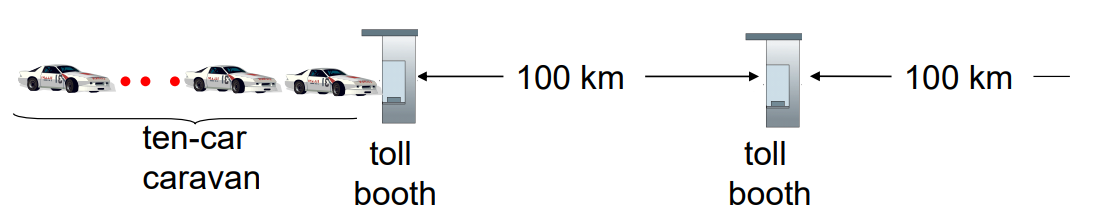 100km마다 요금계산소가 있는 고속도로를 가정하자. 이때 요금계산소(toll booth)는 라우터, 요금계산소 사이는 링크로 생각할 수 있다