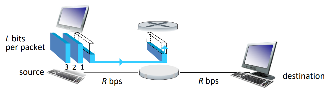 - 전송 지연(transmission delay): 라우터가 패킷을 링크로 밀어내는 시간