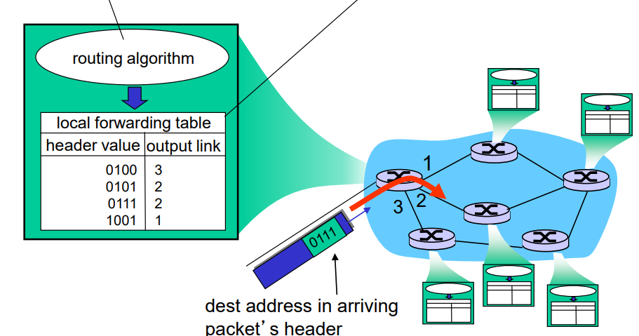 그리고 그 경로를 이동하는 동안 어떤 라우팅에 도착한 패킷이 있을 때, 그 라우팅은 패킷을 어느 링크로 전달하는지 결정하는데 전달 테이블이 쓰인다.
