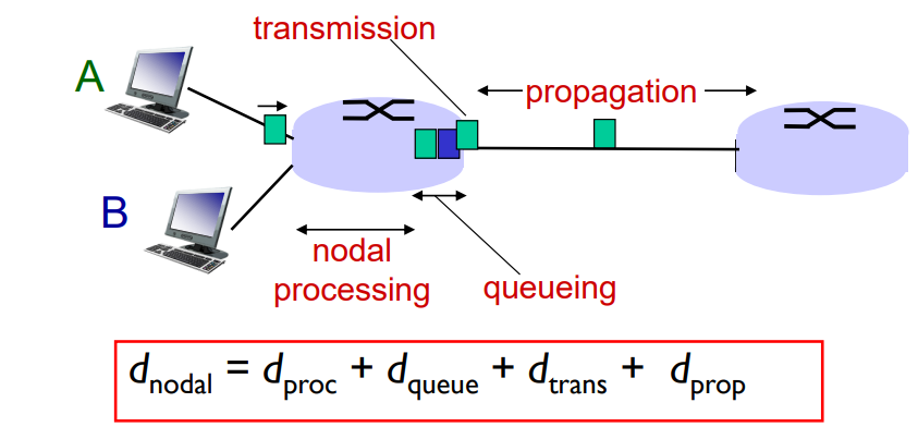 - 큐잉 지연(queuing delay): 큐에 저장되어 링크로 전송되기까지 기다리는 시간