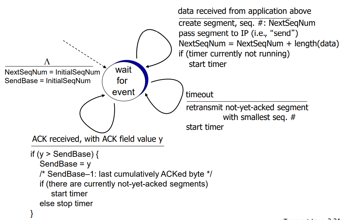 위 그림은 TCP 송신자의 간소화된 기술을 FSM으로 나타낸 것이다.