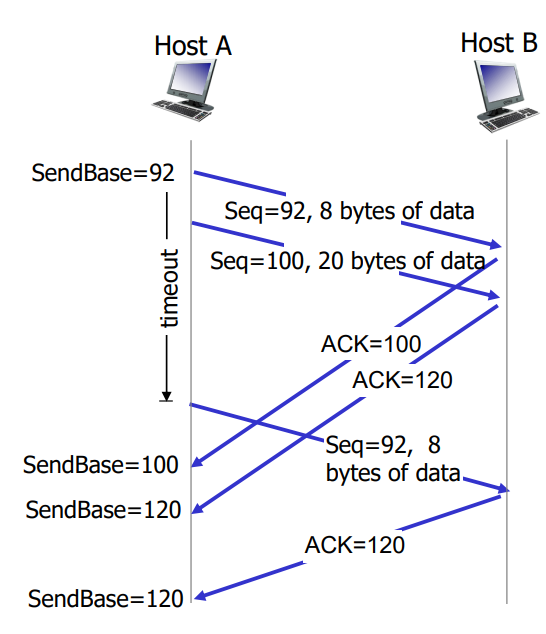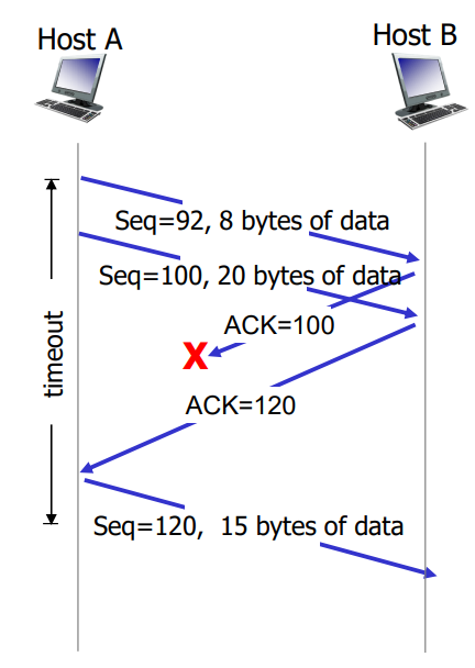 이 사진은 ACK 패킷을 유실하였을 때의 상황이다. Host A에서는 ACK 패킷을 받지 못하였으니 타이머가 그대로 작동하게 되어 timeout이 일어나 패킷을 다시 전송하게 된다.