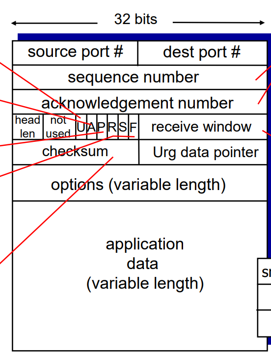 TCP 세그먼트 구조는 UDP 세그먼트 구조보다 복잡한 편이다.