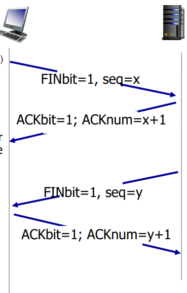 연결이 끝날 때를 가정해보는데, 클라이언트가 연결 종료를 결정한다고 하자연결이 끝나면 호스트의 자원들은 회수되어야 하는데, 이때 클라이언트 TCP가 서버 프로세스에게 세그먼트를 보내도록 한다.이때 세그먼트의 헤더에는 플래그 비트중 하나인 FIN 비트를 1로 설정해서 송신한다.서버가 해당 세그먼트를 수신하면 서버는 클라이언트에게 확인했다는 ACK 세그먼트를 보내게 되고, 이후 마찬가지로 FIN 비트가 1인 세그먼트를 송신하게 된다.클라이언트가 해당 세그먼트를 수신하면 서버에 ACK 세그먼트를 보내게 되며 이 시점에서 두 호스트의 모든 자원들이 할당 해제가 된다.
