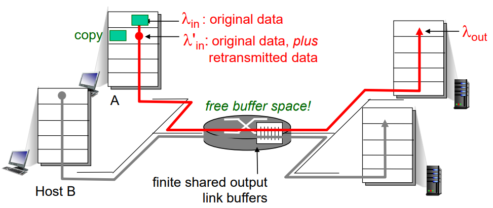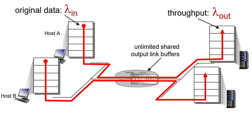 이 시나리오에서는 호스트 A와 호스트 B가 같은 λin byte/sec으로 보내고 있는 이상적인 환경이라고 가정하고, 마찬가지로 라우터의 패킷 처리 속도는 λin byte/sec라고 하자