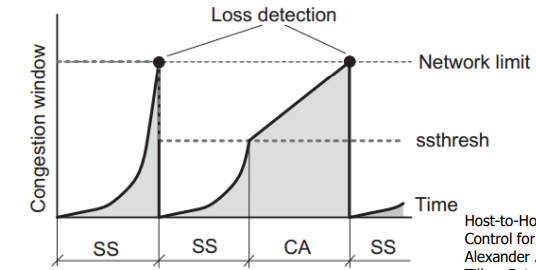 하지만 여기서도 slow start와 똑같이 혼잡 상태가 되면 cwnd값을 1로 설정하고, 추가로 ssthreash값을 혼잡 상태가 일어난 cwnd값의 반절로 설정을 하고 다시 slow start로 시작한다.