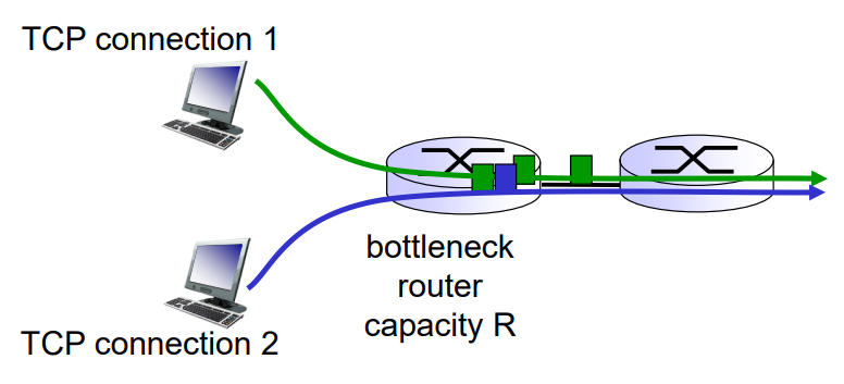 위에서 언급했듯이 종단간의 혼잡제어는 네트워크 계층이 전혀 피드백을 하지 않는다. 그래서 TCP가 혼잡제어를 해야한다.