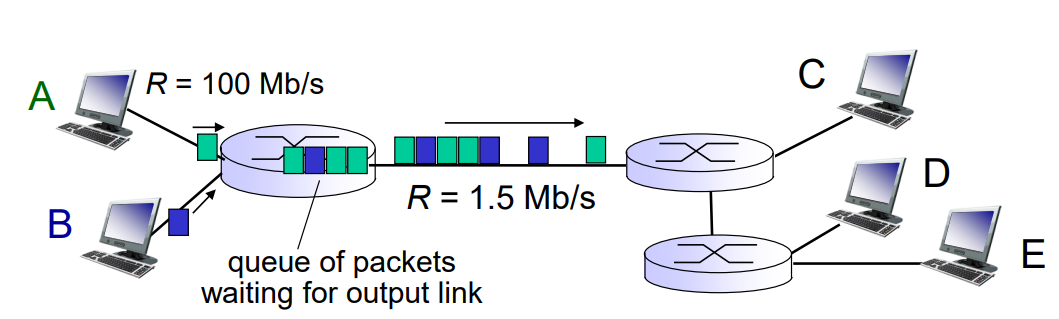우리는 1장에서 라우터가 패킷을 처리하기 전에 큐에 들어간다는 것을 배운적이 있었다. 그런데 라우터는 한 번에 하나의 패킷만 처리할 수 있어서 많은 수의 패킷이 들어오게 되면 아직 처리를 못한 패킷은 큐에 저장을 한다. 이때 큐의 용량이 꽉차게 되면 패킷 손실이 일어난다는 배웠다.