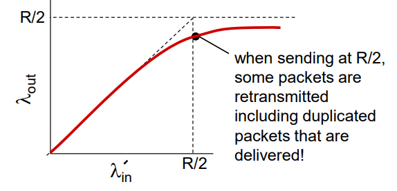여기서는 데이터에 원래 보내는 데이터와 재전송해야하는 데이터가 있어서 R/2로 보내면 원래 데이터의 성능이 낮게 나온다. 하지만 재전송을 보내는 패킷은 우리가 버퍼가 비었을 때를 가정해서 보내기 때문에 데이터양이 늘리면 R/2로 수렴을 하게 된다.