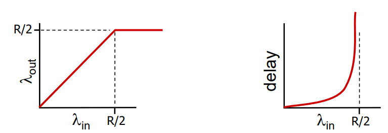 이제 왼쪽 그래프를 살펴보면 호스트에서 아무리 많은 패킷을 보내봤자 라우터의 패킷 처리는 R로 제한되어 있으므로 여기서는 호스트 A, 호스트 B 두명이 패킷을 보내니까 한 명의 호스트는 최대 R/2의 패킷을 처리 받을 수 있는 것이다.