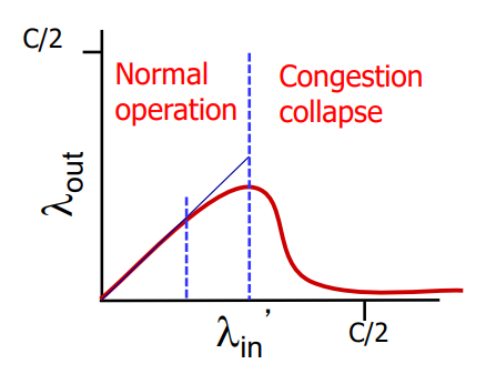 이 그래프는 호스트 A → 호스트 C로 가는 패킷이 잘 가고 있다가 어느 순간부터는 패킷이 쌓이게 되는 경우를 말한다. 이러면 호스트 A → 호스트 C로 가는데 재전송으로 패킷이 쌓이게되어 호스트 B → 호스트 D로 잘 가고 있던 패킷보다 기하급수적으로 많아지는 경우, 패킷들도 경쟁을 하기 때문에 버퍼가 호스트 A → 호스트 C의 패킷으로 채워지게 된다. 그러면 잘 가고 있던 호스트 B → 호스트 D의 처리량이 0에 가까워지게 된다는 것이다.