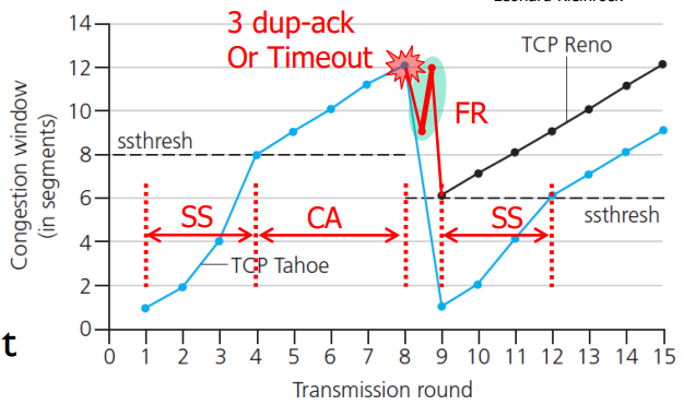 이후에도 중복된 ACK이 나온 수만큼 더해주어서 12 → 9 → 12가 된다. 이후엔 cwnd/2로 변경해서 다시 1씩 올린다.