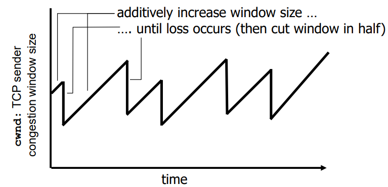 TCP 송신자가 경로에 혼잡이 없으면 매번 RTT당 cwnd의 크기를 1MSS씩 높이고(additive increase), 송신률을 서서히 높이다가 나중에 혼잡이 존재하게 되면 cwnd의 크기를 반절로 줄이고 다시 RTT당 1MSS씩 올린다.(multiplicative decrease)