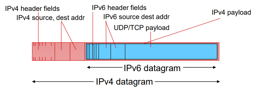 위 사진처럼 IPv4의 데이터그램이 IPv6의 데이터그램보다 크기 때문에 IPv4의 데이터 필드에 IPv6 데이터그램을 넣는다. (캡슐화)