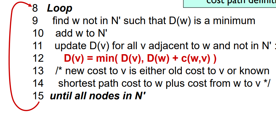 9: 어떤 노드 w가 N'에 속하지 않고, D(w)의 값이 최솟값이 될 때