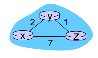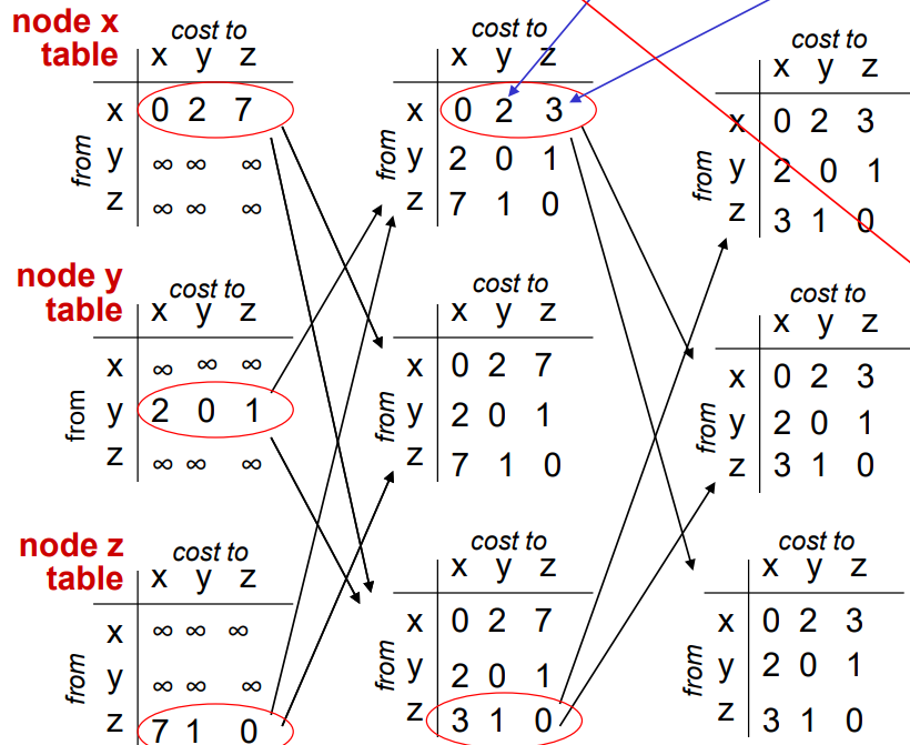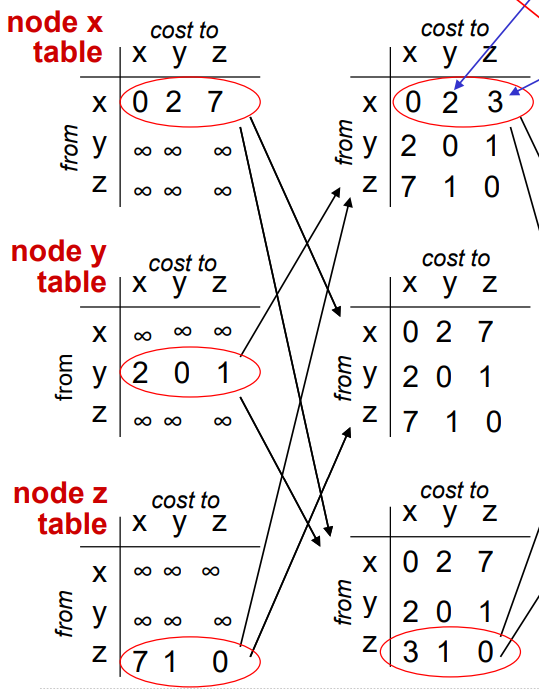 제일 처음에는 노드 x, 노드 y, 노드 z가 전부 자신과 관련된 정보만 가지고 있을 것이다.