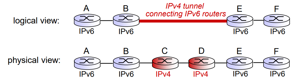 이러면 IPv4 라우터는 해당 데이터그램이 IPv4인줄 알고 전달을 하게 되고, 다시 라우터 E부터는 IPv6으로 데이터를 전송하게 된다.