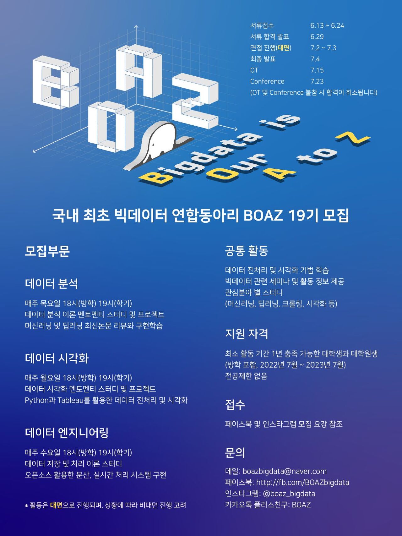 면접 볼 당시에는 열심히 활동할 것이라고 마음을 먹었지만, 지금 지원할 때와 현재 상황이 많이 달라져서 정상적인 동아리 활동을 하기엔 힘든 상황이라 오티까지만 갔다 오고 탈퇴했습니다. 너무 아쉽네요. 요즘 웬만한 이름 있는 기업이라면 데이터 직군을 따로 모집하고 있으니 예비 데이터 엔지니어 분들은 최고의 활동일 것 같습니다.