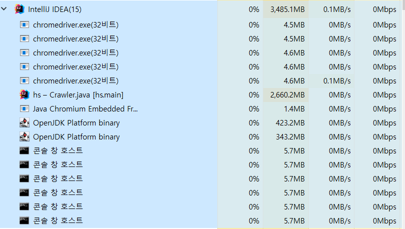 그러다가 작업관리자를 실행하여 발견한 것이 이게 CPU, 메모리 99% 사용이 되는 주된 원인은 아니지만 크롬드라이버와 콘솔 창 호스트가 엄청 많이 실행되어서 메모리를 어느정도 잡아먹고 있다는 사실을 발견했다.