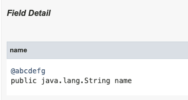 package ladder.domain; import java.lang.annotation.ElementType; import java.lang.annotation.Target; @Target(ElementType.FIELD) public @interface abcdefg { }@abcdefg에는 @Documented 어노테이션이 없는 상태이다.