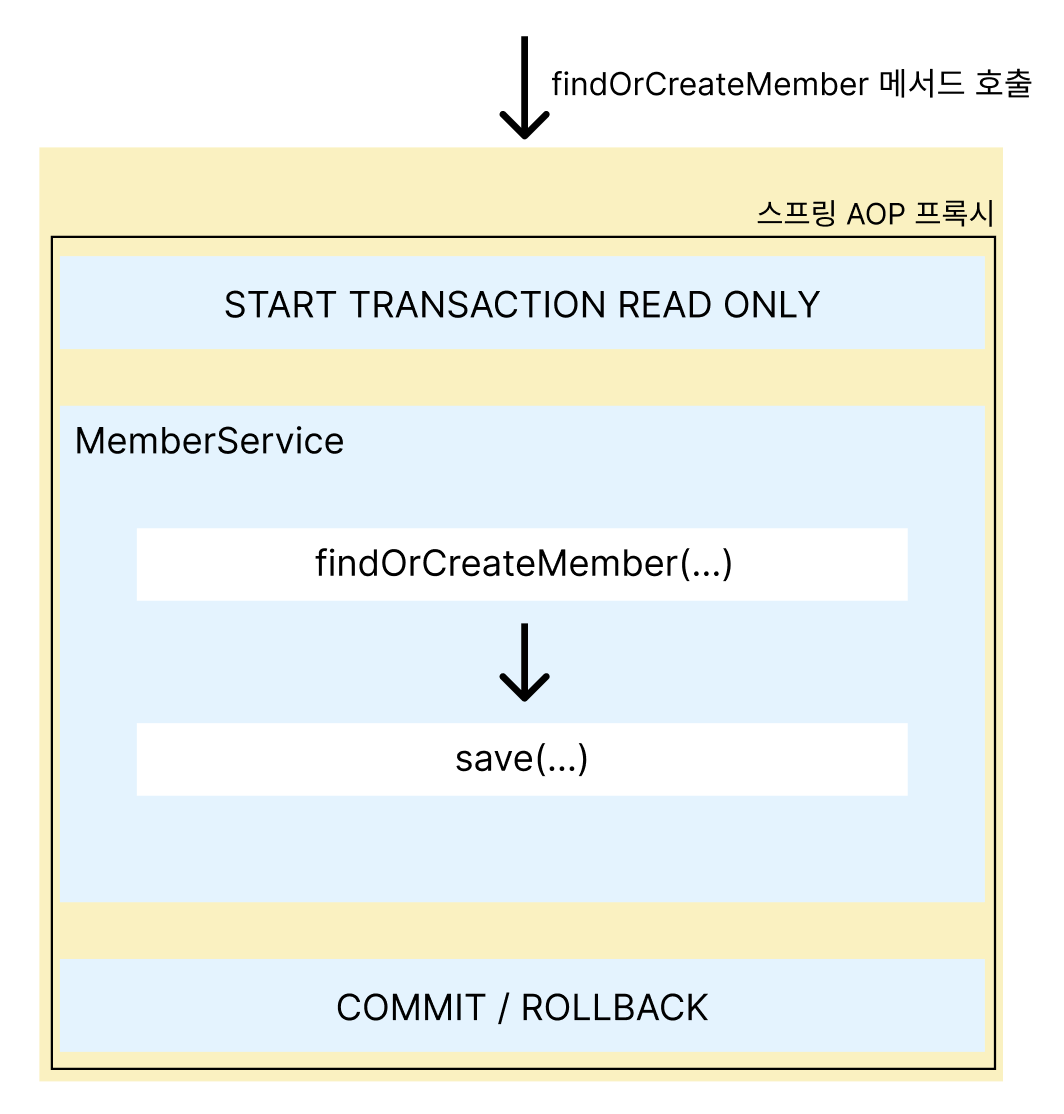 이때 save 메서드는 findOrCreateMember 메서드와 같은 클래스에 존재하기 때문에 @Transactional을 적용되도 무시된다는 것이죠