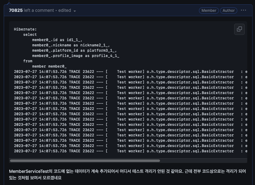 테스트 로그를 확인해보니 저는 서비스 메서드 실행에서 문제가 발생할 줄 알았는데, 다른 곳에서 문제가 발생하고 있었습니다.
