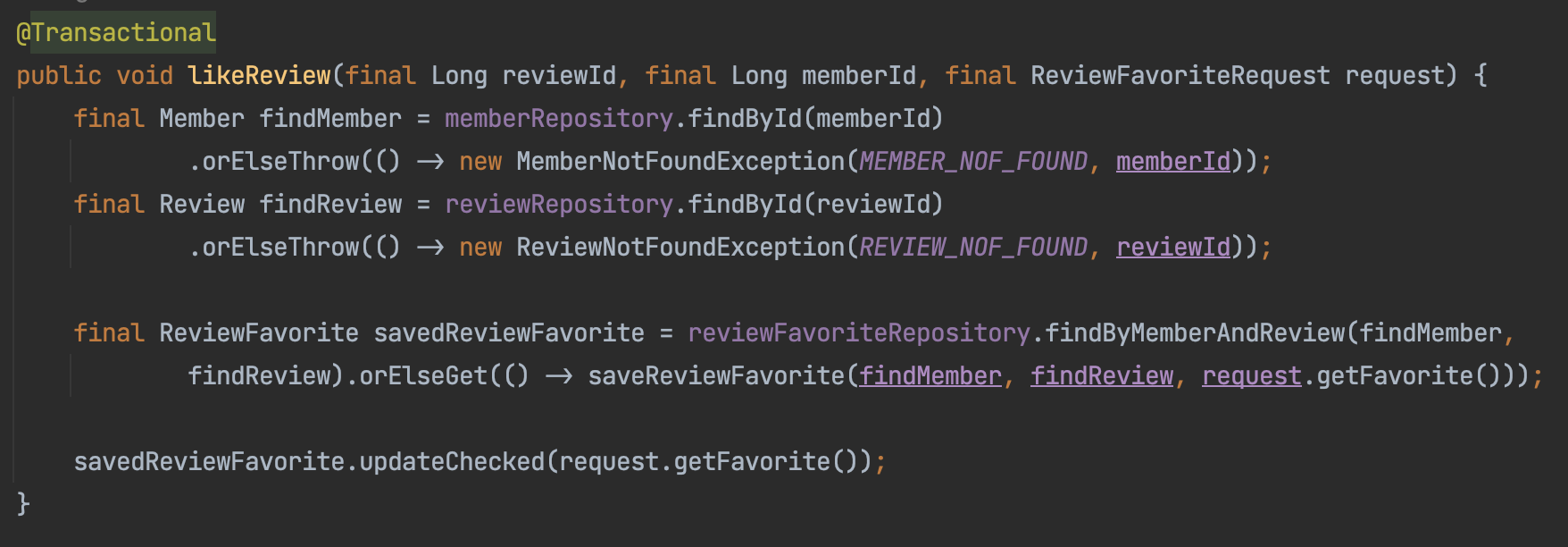 1. 사용자가 존재하는지, 리뷰가 존재하는지 확인합니다. (findMember, findReview)