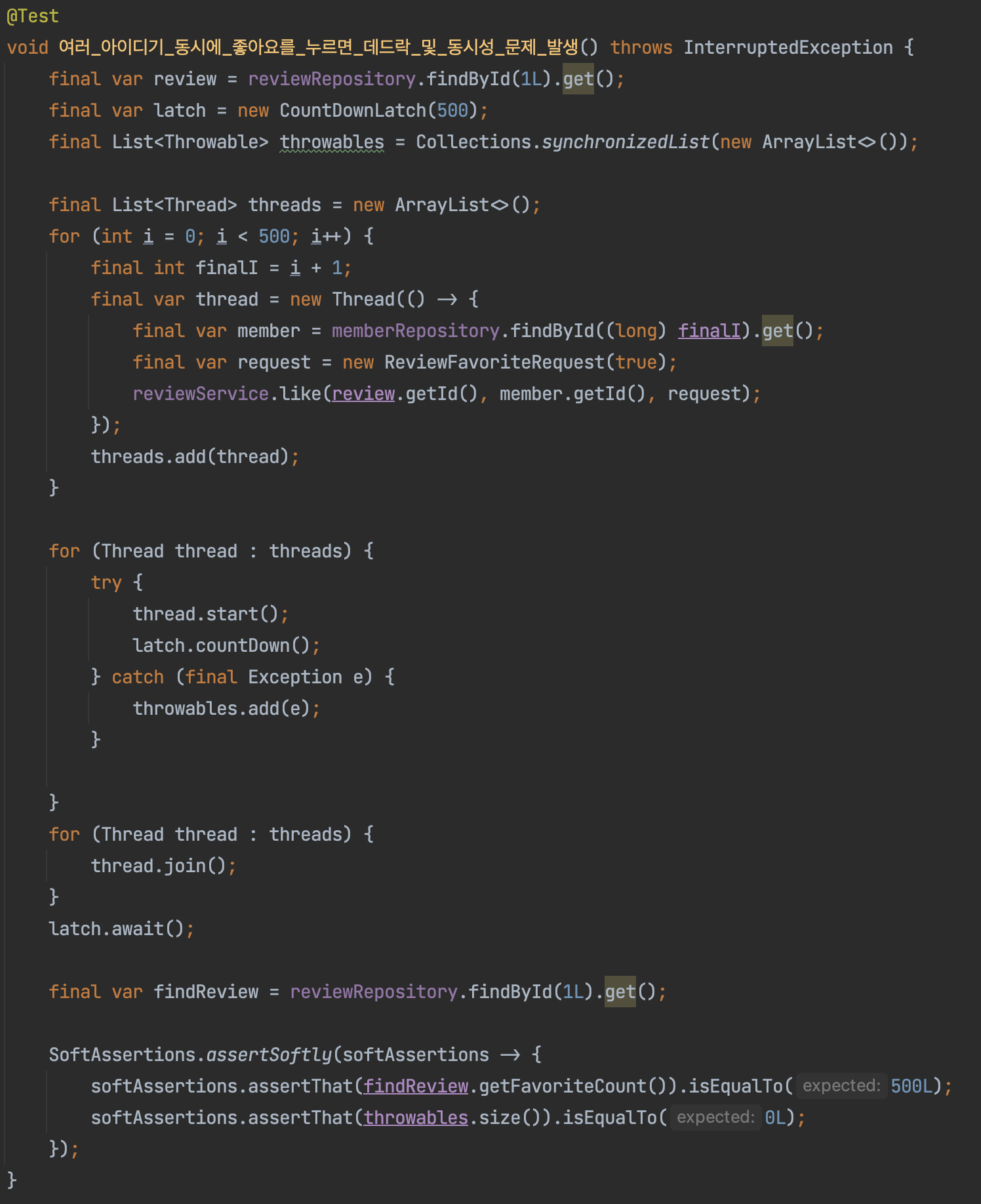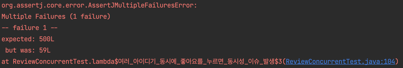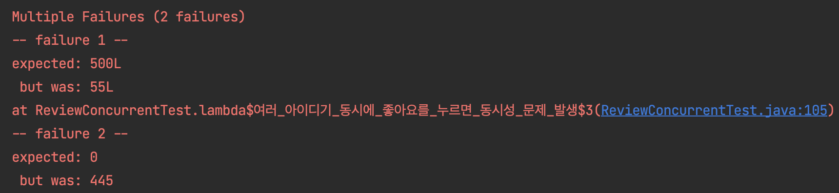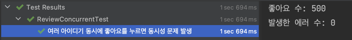 동시성 문제의 경우에는 500명이 리뷰 좋아요를 동시에 눌렀을 때, 좋아요 수가 500개가 아닌 50여개만 나오는 상황입니다.