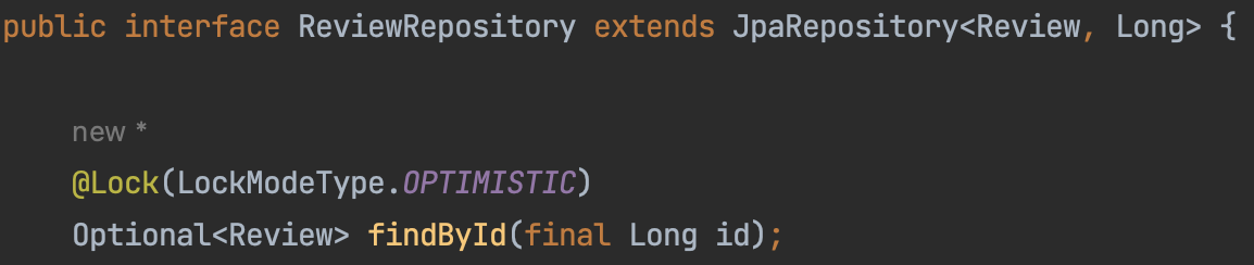 필요한 부분만 캡쳐하기 위해 맨 위에 추가 그리고 Repository에는 @Lock(OPTIMISTIC)을 설정합니다.