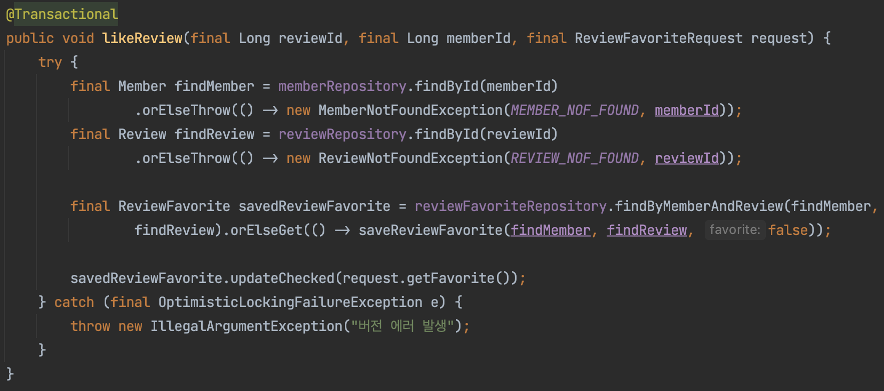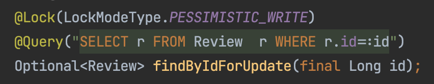 저는 X Lock의 범위를 작게 잡는 것이 좋으므로 likeReview 안에 있는 saveReviewFavorite에 X Lock을 걸었습니다.