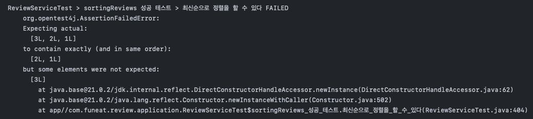 https://funeat.site/products/store/4216 에러가 발생하는 곳은 최신순으로 정렬한 리뷰를 검증하는 테스트 코드에서 나오게 된다.