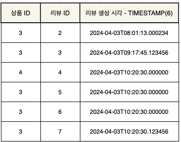 예시를 들어서 설명해보면, 만약 3번 상품에서 가장 마지막에 데이터로 보내준 리뷰가 6번 리뷰라고 가정해보자. 이때 최신순으로 정렬해서 보여줄 경우 다음 페이지는 6번 리뷰보다 더 일찍 작성한 리뷰들이 보일 것이다.