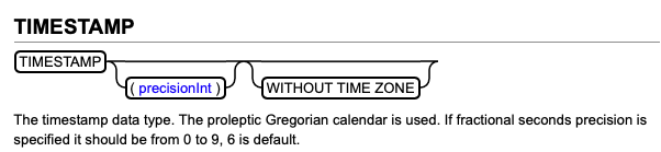 http://www.h2database.com/html/datatypes.html#timestamp_type H2 데이터베이스 공식문서를 살펴보면 TIMESTAMP은 최대 소수점 아래 9자리수까지 저장할 수 있다. 하지만 기본값은 소수점 아래 6자리까지 저장한다.