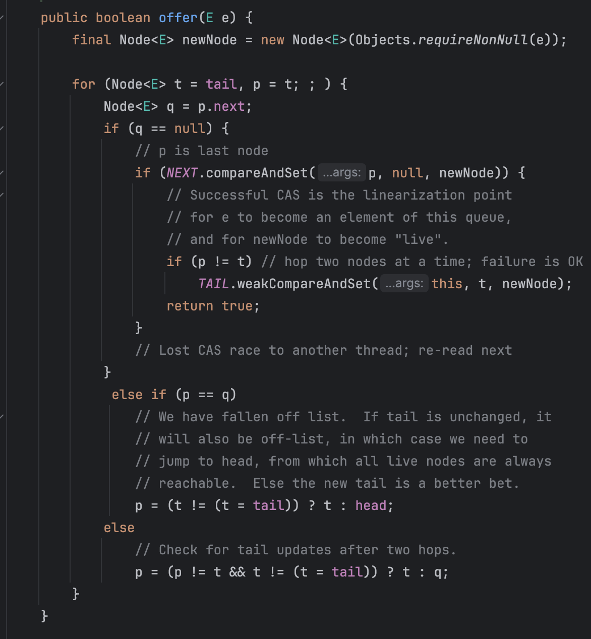 첫번째 if문을 보면 꼬리에 원소를 삽입하려고 하는데, CAS 연산을 해서 꼬리 다음의 원소가 null이면 newNode를 저장하는 로직이 있다. 이후 TAIL 노드도 업데이트를 진행한다. 여기에서 만약 두 스레드가 동시에 원소 삽입을 했지만, 먼저 삽입되는 원소가 있다면 하나는 if (NEXT.compareAndSet(p, null, newNode)를 통과하지 못하고, 다시 for문을 처음부터 돌릴 것이다. 이러면 락 없이 동시성 문제도 해결 가능하다.