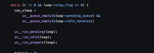https://github.com/libuv/libuv/blob/v1.x/src/unix/core.c#L415 Node JS도 Event Loop가 stop_flag가 1이 되지 않을 떄까지 계속 돌아간다. 이때 r은 Event Loop가 살아있는지 확인하는 용도다.