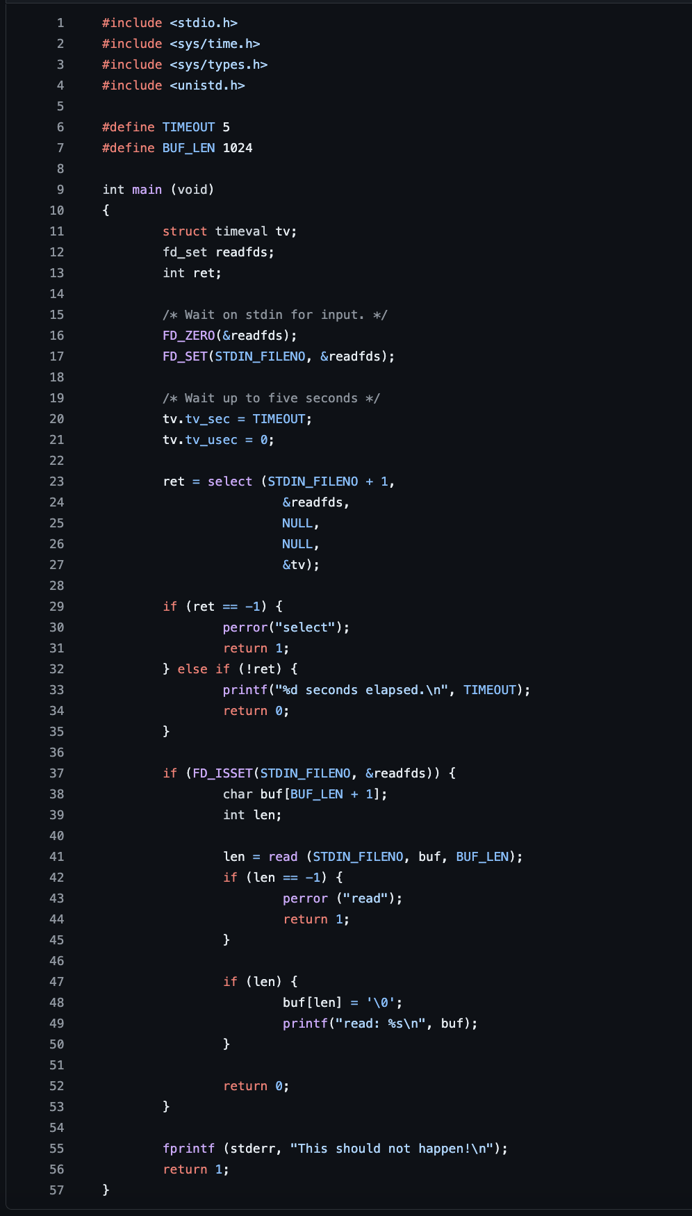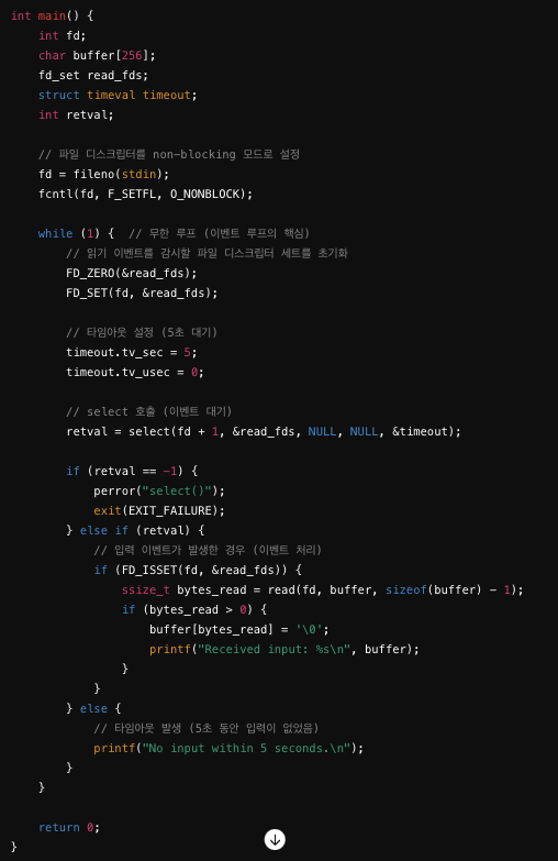 GPT-4o에게 'event loop의 간단한 예시를 알려주세요. c언어로 만들어주세요'라고 하면 아래처럼 작성해준다.
