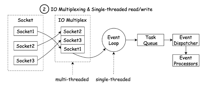 예시로 nodejs 구조를 가지고 왔다. 이벤트 루프는 이벤트가 발생하면 이것을 처리할 수 있는 핸들러에게 넘기는 역할을 한다. 보통 스레드 하나가 이벤트 루프를 담당하는데, 스레드 하나가 담당해도 성능이 보장되며 이벤트 큐에 접근하는 이벤트 루프가 1개 이기 때문에 동시성 문제에서 자유롭다는 특징을 가지고 있다. 멀티 스레드 이벤트 루프를 사용하게 된다면 여러 이벤트 루프가 하나의 이벤트 큐에 접근하기 때문에 동시성을 고려해야하고, 까딱하면 성능이 더 안좋을 수도 있다. 하지만 제대로 프로그래밍을 하면 그만큼 CPU를 더 효율적으로 사용할 수 있다고 한다. 싱글 스레드 이벤트 루프를 사용하는 기술은 NodeJS, Redis가 있고, 멀티 스레드 이벤트 루프를 사용하는 기술은 Netty, Vert.x가 있다.
