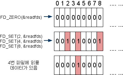 - readfds : 읽을 데이터가 있는지 검사하기 위한 구조체